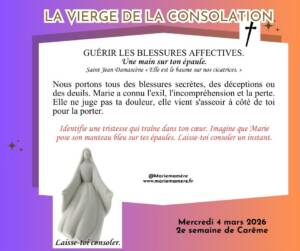 Nous portons tous des blessures secrètes, des déceptions ou des deuils. Marie a connu l’exil, l’incompréhension et la perte. Elle ne juge pas ta douleur, elle vient s’asseoir à côté de toi pour la porter.